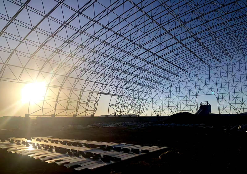 3、材料:正放四角錐螺栓球節(jié)點網架,按照甲方確認的圖紙設計要求加工制作。網架主材材質為Q355B鋼管,底漆二道70um,主檁條鍍鋅C型鋼C220*75*20*3.0,次檁條鍍鋅C型鋼C180*70*20*2.5,屋面板0.5mm厚彩鋼單板