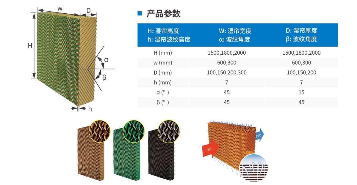在自然界水份蒸發(fā)會降低溫度;濕簾在波紋狀的纖維紙表面有層薄薄的水膜,當(dāng)室外干熱空氣被風(fēng)機吸抽穿過紙墊時,水膜上的水會吸收空氣中的熱量進而蒸發(fā)成為水蒸汽,這樣經(jīng)過處理后的涼爽濕潤的空氣就進入室內(nèi)了.濕簾降溫原理正是利用了風(fēng)機與濕簾的有效組合人為再現(xiàn)了自然界水份蒸發(fā)降溫這一物理現(xiàn)象達到降溫目的。